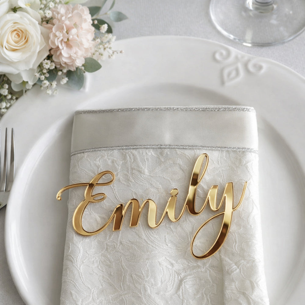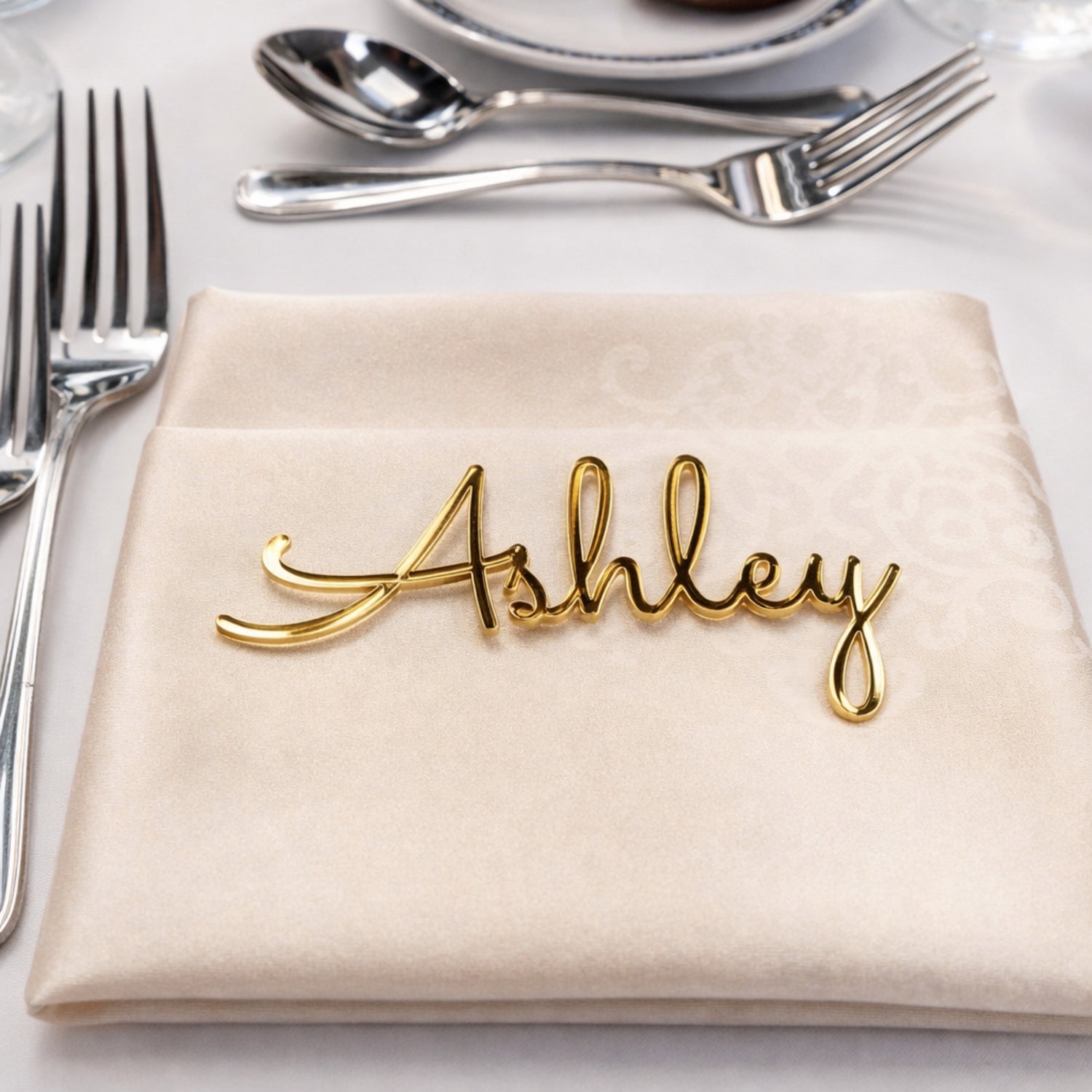 Designed by the experts at FranJohnsonHouse™, these laser cut names are more than just signage; they are structural art for your tablescape