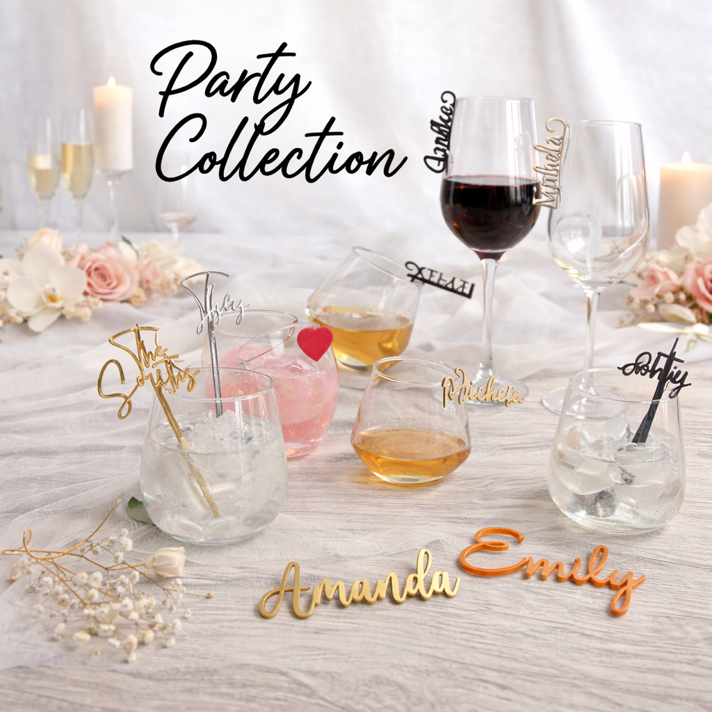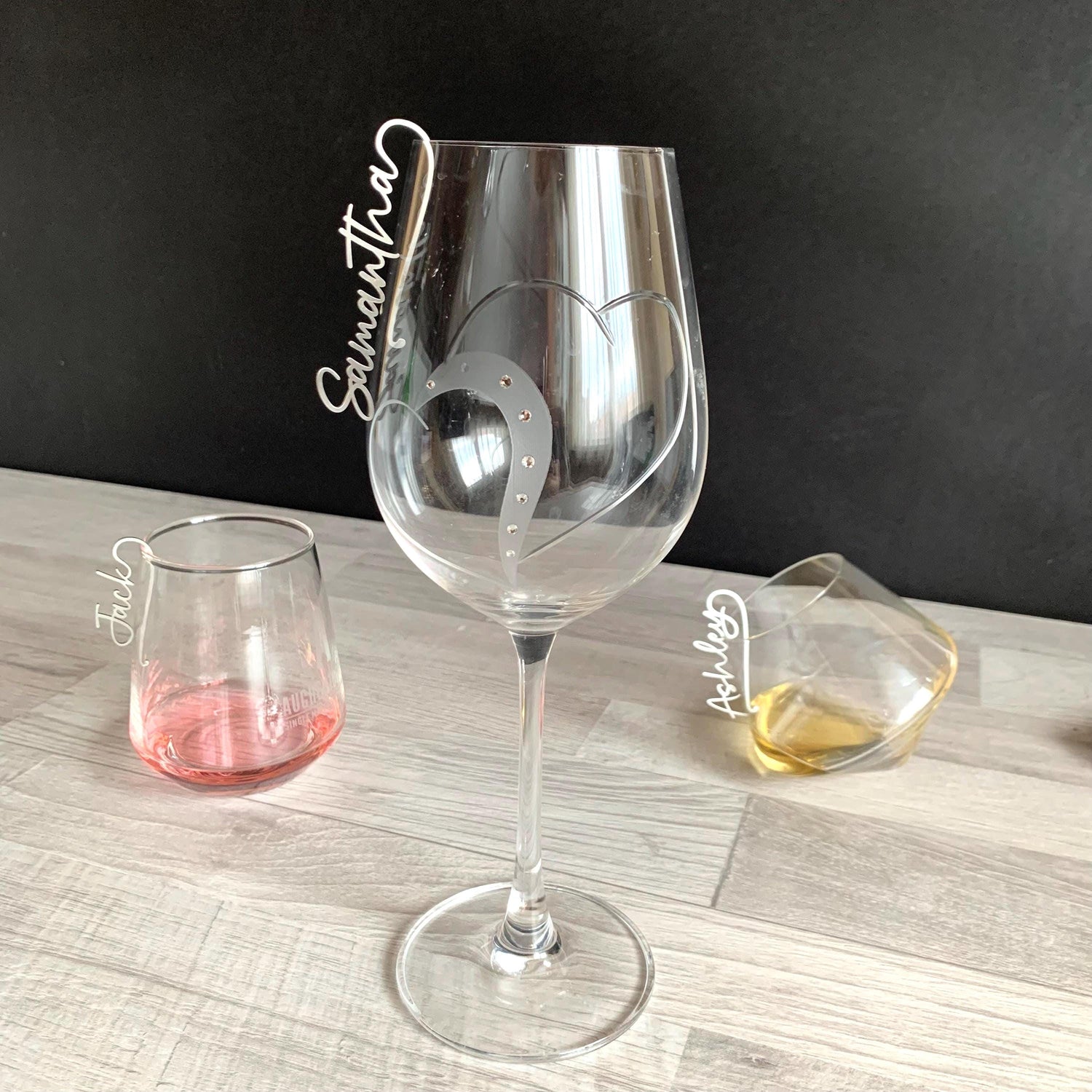 Designed by the experts at FranJohnsonHouse™, these elegant laser-cut markers attach to wine or cocktail glasses, serving as drink identifiers, place cards, and keepsake favors all in one.